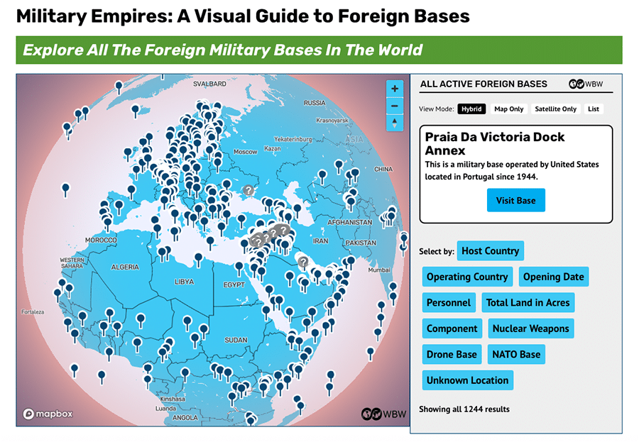 Die US-amerikanische Organisation «worldbeyondwar.org betreibt eine digitale Plattform, auf der man die dort eingezeichneten Militärbasen anklicken kann und darauf lesen kann, was über diese Militärbase bekannt ist, zum Beispiel wie groß die Militärbase flächenmäßig ist und wieviele US-Amerikaner dort beschäftigt sind. Da kann man zum Beispiel sehen, welche US-Militärbasen in Deutschland existieren und was dort abläuft. Alles nur in Englisch, aber leicht verständlich. Vielleicht spielen Sie, hochgeschätzte Leserinnen und Leser, da ein bisschen rum! Vielleicht klicken Sie auf der rechten Seite das Feld «Host Country» an und schreiben da «Germany» rein und schon sehen Sie, wo und wie die USA in Deutschland ihre Herrschaft ausüben!