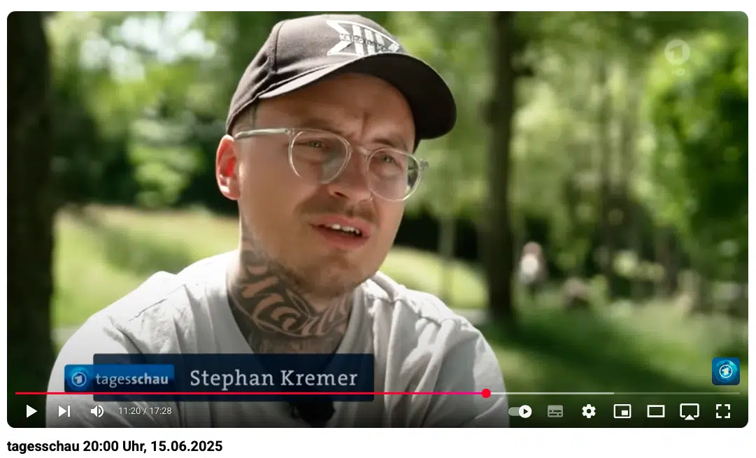 In der deutschen Tagesschau vom 15. Juni 2025 erklärt der heute 35-jährige Bundeswehr-Veteran Stephan Kremer, wie einer seiner Kollegen in Afghanistan 2011 "sein Leben gegeben" hat ... (Screenshot)