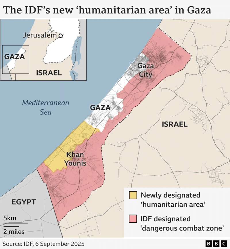Einige Familien flohen aufgrund der Drohungen der israelischen Armee und ihrer Versprechungen von verfügbaren Unterkünften, Zelten und Hilfsgütern direkt in den Süden, wo sie jedoch eine noch schlimmere Situation vorfanden. Die israelischen Streitkräfte haben nun zwei der größten Städte im Süden – Khan Yunis und Rafah – eingenommen, während die Menschen dort in der Zentralprovinz und in al-Mawasi in der Nähe von Khan Yunis zusammengepfercht sind und nicht genügend Platz zum Aufstellung von Zelten für die Vertriebenen aus Gaza-Stadt vorhanden ist.
