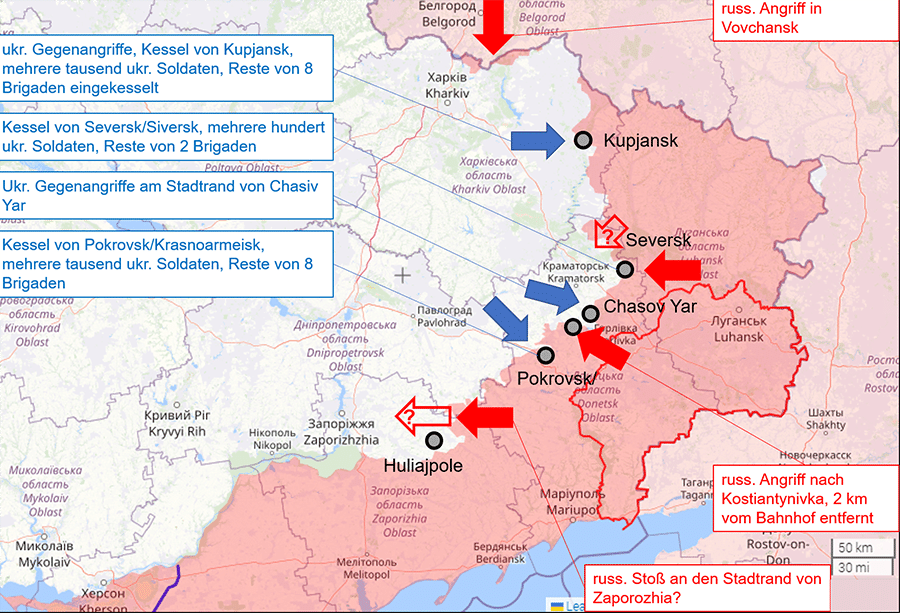 Das Tempo des russischen Vormarsches im Osten der Ukraine hat sich in den letzten Wochen merklich erhöht, fast täglich stoßen die Russen nun bis zu 5 km täglich vor und erobern auch größeren Siedlungen mit einer Geschwindigkeit, die man so bisher nicht beobachtet hatte. Insgesamt haben die Russen in den letzten Tagen mindestens in drei Räumen ukrainische Gegenangriffe abgewehrt und ihrerseits an mehreren Orten angegriffen. Es ist davon auszugehen, dass die Russen die Angriffsvorbereitungen der Ukrainer erkannten und sich in der Lage fühlten, mit deren Gegenangriffen fertigzuwerden, ohne selbst Angriffe andernorts abbrechen zu müssen. Damit sind sie auch in den kommenden – möglicherweise entscheidenden Tagen – in der Lage, den militärischen Druck auf die Ukraine zu erhöhen. An mehreren Orten sind mittlerweile ukrainische Truppen im Umfang von mehreren tausend Mann eingeschlossen. Ihnen drohen Tod oder Gefangennahme. Diese ukrainischen Truppen in den Kesseln zu retten, dürfte neben Zeitgewinn derzeit das wichtigste Verhandlungsziel der ukrainischen Regierung sein.