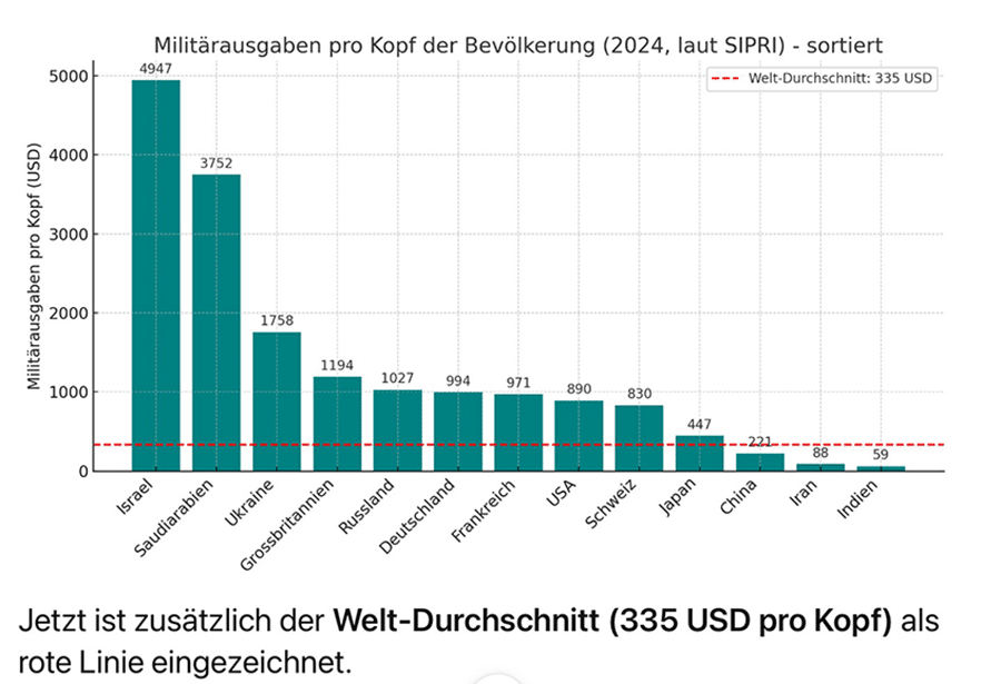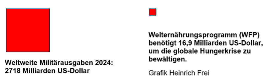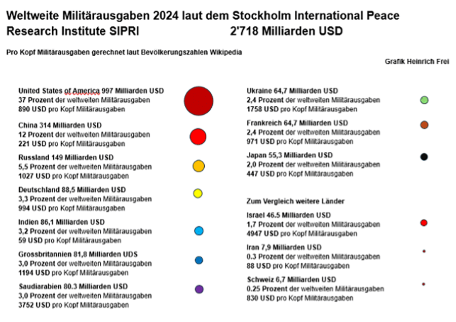 Die Zahlen von SIPRI sind sehr wichtig. Sie bringen vielleicht einige Politiker zur Besinnung, wenn sie noch weiter aufrüsten wollen, um, wie sie sagen, mit mehr Waffen und Soldaten «den Frieden sichern» wollen. SIPRI dokumentierte zum Beispiel, dass 2024 die Militärausgaben der USA 997 Milliarden US-Dollar betrugen und die von Russland 149 Milliarden USD, also über sechsmal weniger als die der USA. SIPRI zeigte auch, dass Deutschland, Grossbritannien, Frankreich und Italien zusammen 273 Milliarden USD für das Militär aufwenden, 1,8-mal mehr als der „Feind“ Russland.