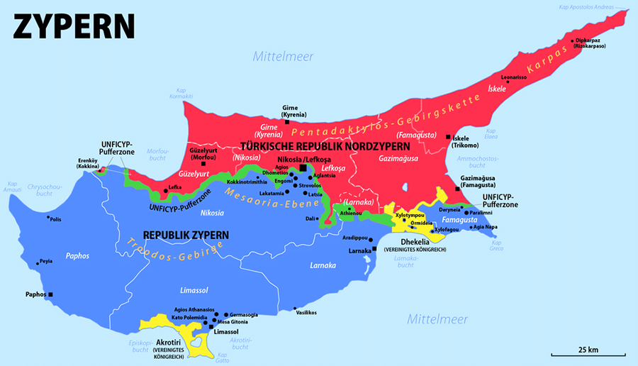 Seitdem teilt eine Demarkationslinie die Mittelmeerinsel von Osten bis Westen in einen türkischen Norden und einen griechischen Süden. Im Jahr 1983 wurde im Norden die Türkische Republik Nordzyperns (KKTC) ausgerufen und einzig von Ankara anerkannt. Völkerrechtlich gilt die KKTC als ein von türkischen Soldaten besetztes Land.